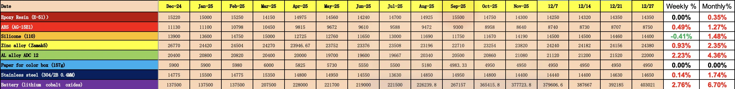 December closed with epoxy resin and ABS showing only modest monthly movement, reflecting cautious downstream demand and firm but contained cost support. Heading into January, buyers still have room to negotiate on spot volumes and staged releases, particularly for epoxy resin and ABS grades. Silicone remains the exception: December’s cost pressure from elevated DMC prices has carried through, so January sourcing should prioritize flexible commitments and short quotation validity rather than locking in long-term volumes at current levels.